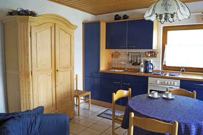 ausgestattet mit Herd, Backofen, Kühlschrank mit Gefrierfach, Kaffeemaschine inkl. Filter, Wasserkocher.